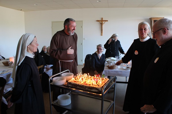 Les Bénédictines sont aidées par les Capucins pour souffler les très nombreuses bougies (il n'y en a tout de même pas 400!)