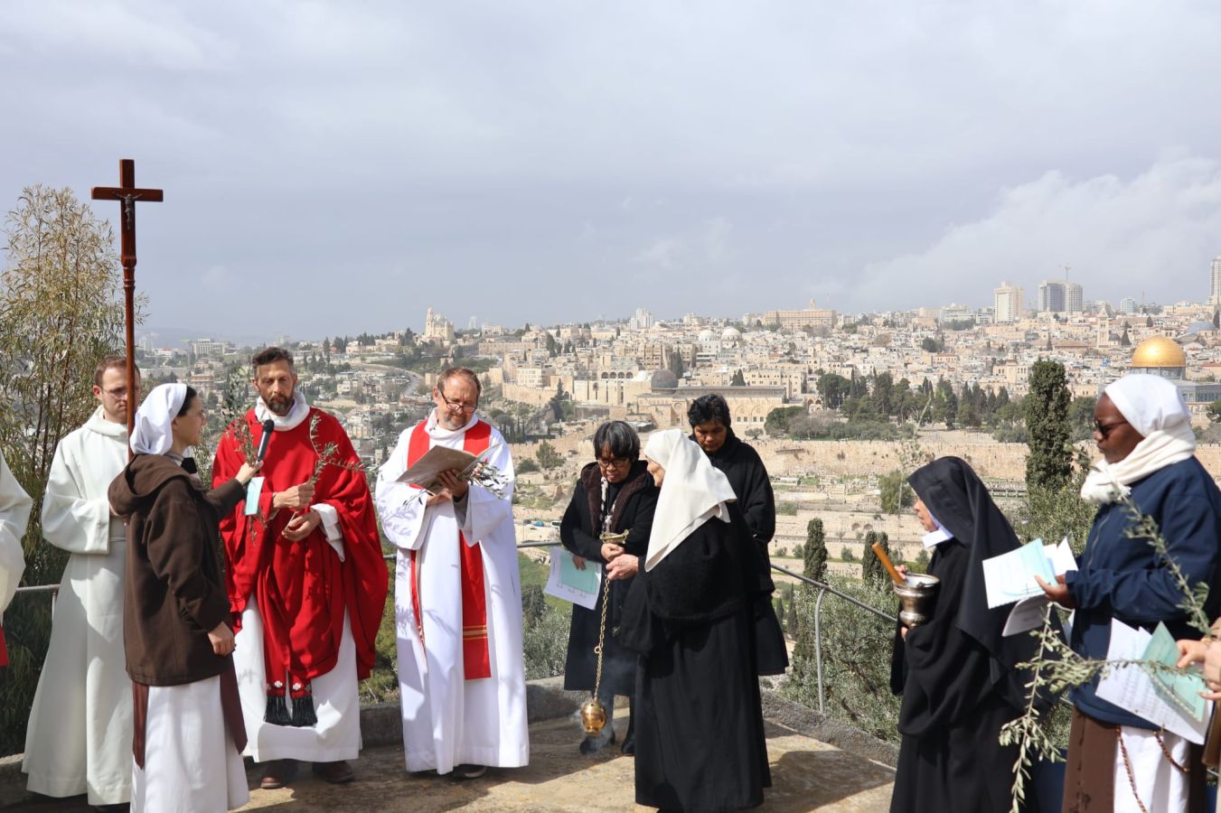 Dans l’après-midi, en bas du Mont des Oliviers, à Gethsémani, lieu de l’agonie, lors du temps de prière pour la paix, Mgr Pizzaballa partageait son émotion (le matin il a été empêché par la police israélienne d’entrer au Saint sépulcre pour célébrer la messe des Rameaux) : « Aujourd’hui, Jésus pleure une fois de plus sur Jérusalem… Il pleure sur cette Terre Sainte, encore incapable de reconnaître le don de la paix. Il pleure pour toutes les victimes d’une guerre qui semble sans fin : pour les familles divisées, pour les espoirs brisés. Mais les larmes de Jésus ne sont jamais stériles : elles ouvrent nos yeux, nous interpellent et révèlent la vérité ». Si la guerre « a interrompu notre cheminement festif, rendant difficile même la simple joie de suivre notre Roi… elle n’effacera pas la résurrection » a assuré le patriarche. « Le chagrin n’éteindra pas l’espérance… Aujourd’hui, nous ne portons pas de rameaux en procession (...) Nous n’agitons pas de branches d’olivier ; nous choisissons plutôt de devenir des artisans de réconciliation, à travers chaque geste, chaque parole, chaque relation ».